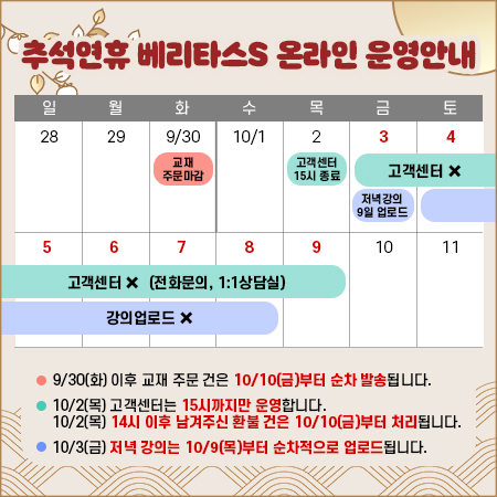 Ãß¼® ¿¬ÈÞ(10/3~10/9)¿¡ µû¸¥ °í°´¼¾ÅÍ ¿î¿µ ¹× ±³Àç ¹ß¼Û ¾È³»µå¸³´Ï´Ù.
